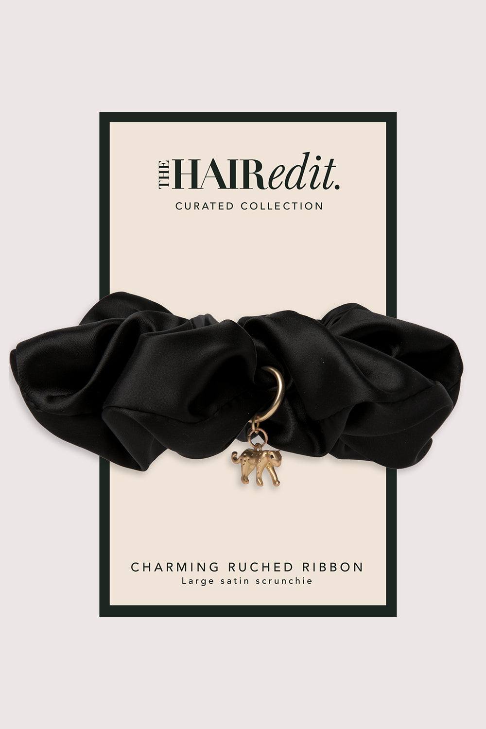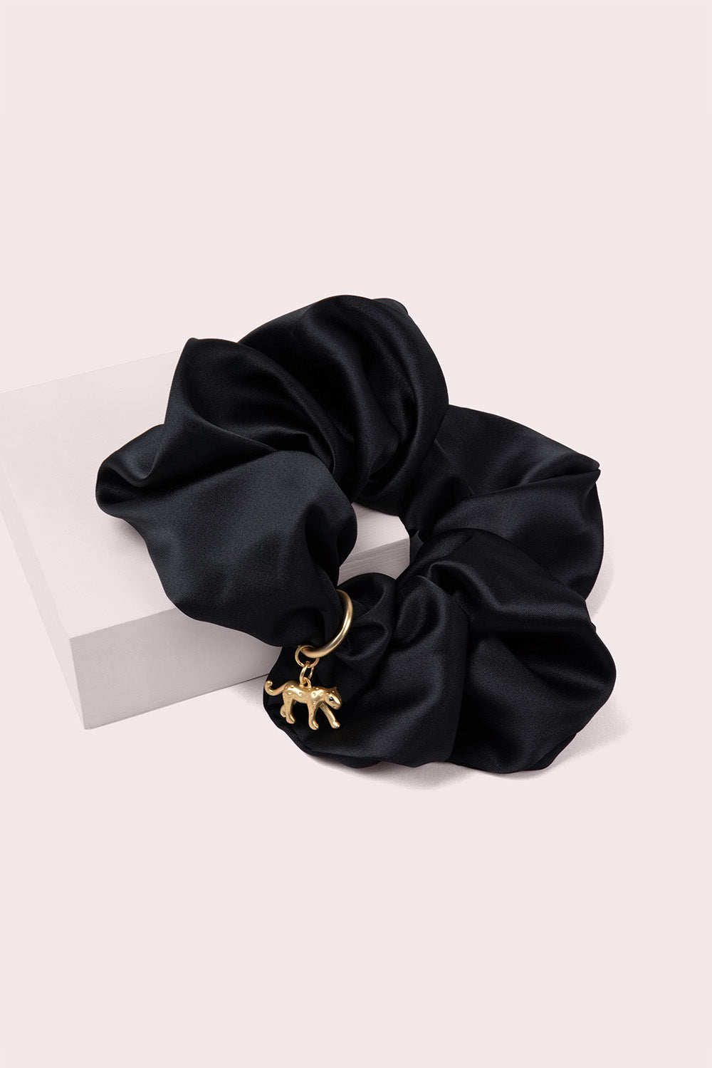 Add charm with this extra-large ruched scrunchie. Its satin finish with a cheetah charm will add pizazz to any look.