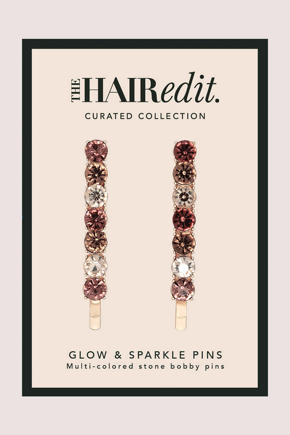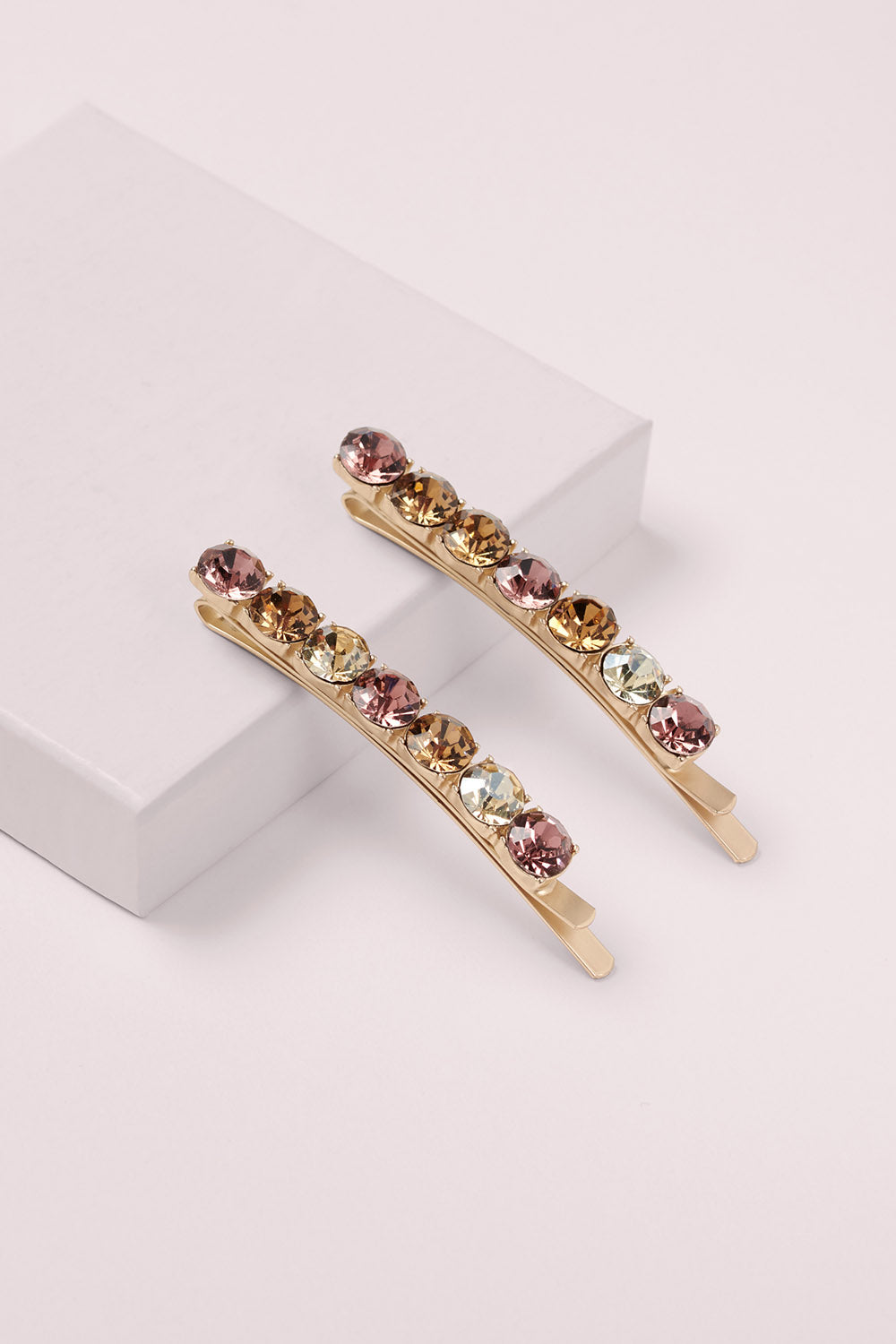 - Two luxe multi-colored stone bobby pins set in soft gold