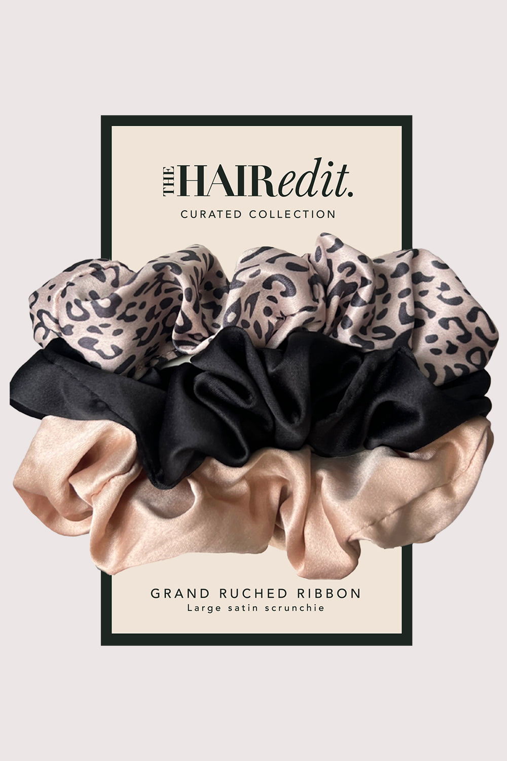 The perfect trio of large ruched ribbon scrunchies. Add neutral color or pattern to your pony to wear during the day or to sleep at night.Â